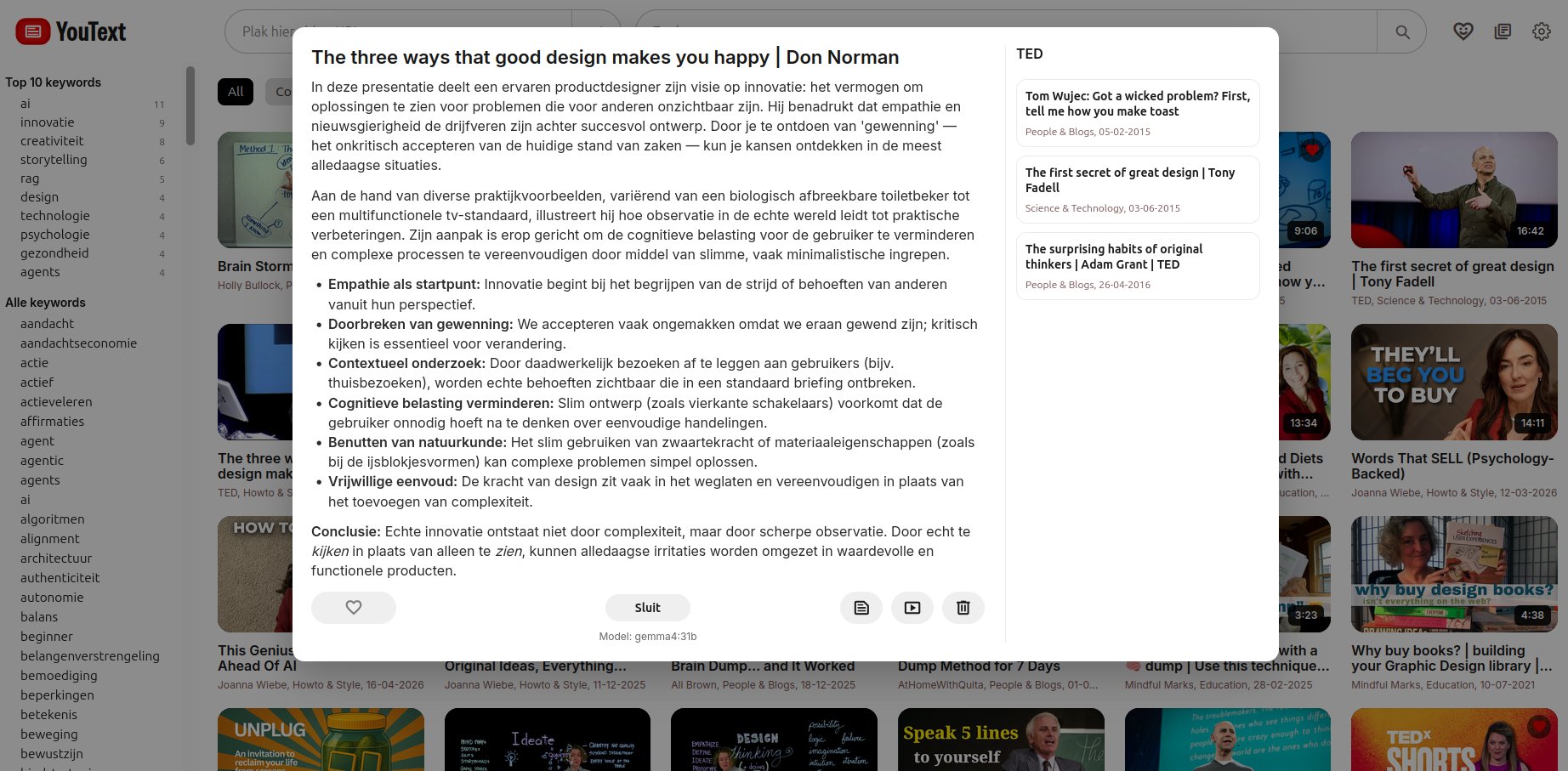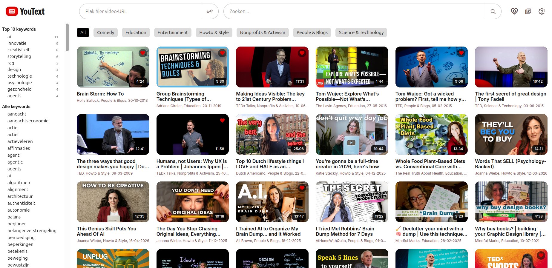 Naast de keywords heeft YouText nu een snelle zoekfunctie, categorie-filters (zijn die nog wel nodig nu ik keywords heb?) en favorieten/bookmarks. Ook kun je nu de complete transcriptie van de video downloaden. Dit kan afhankelijk van de video vele pagina's lang zijn en ik gebruik dit om een boek via ChatGPT verder te bevragen.